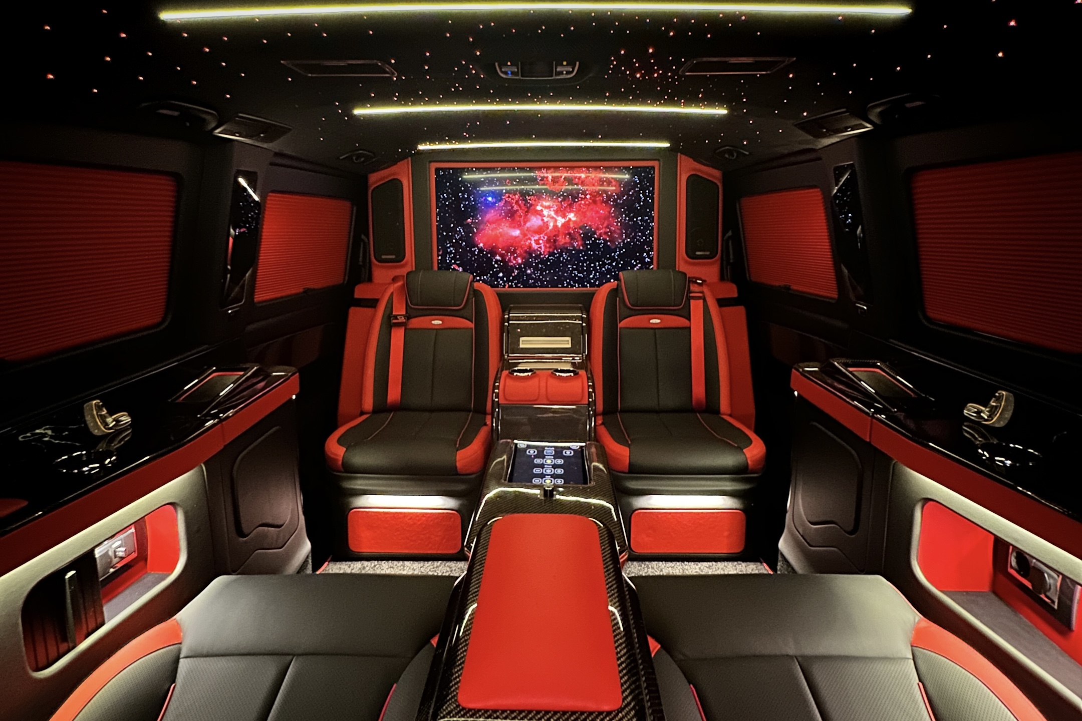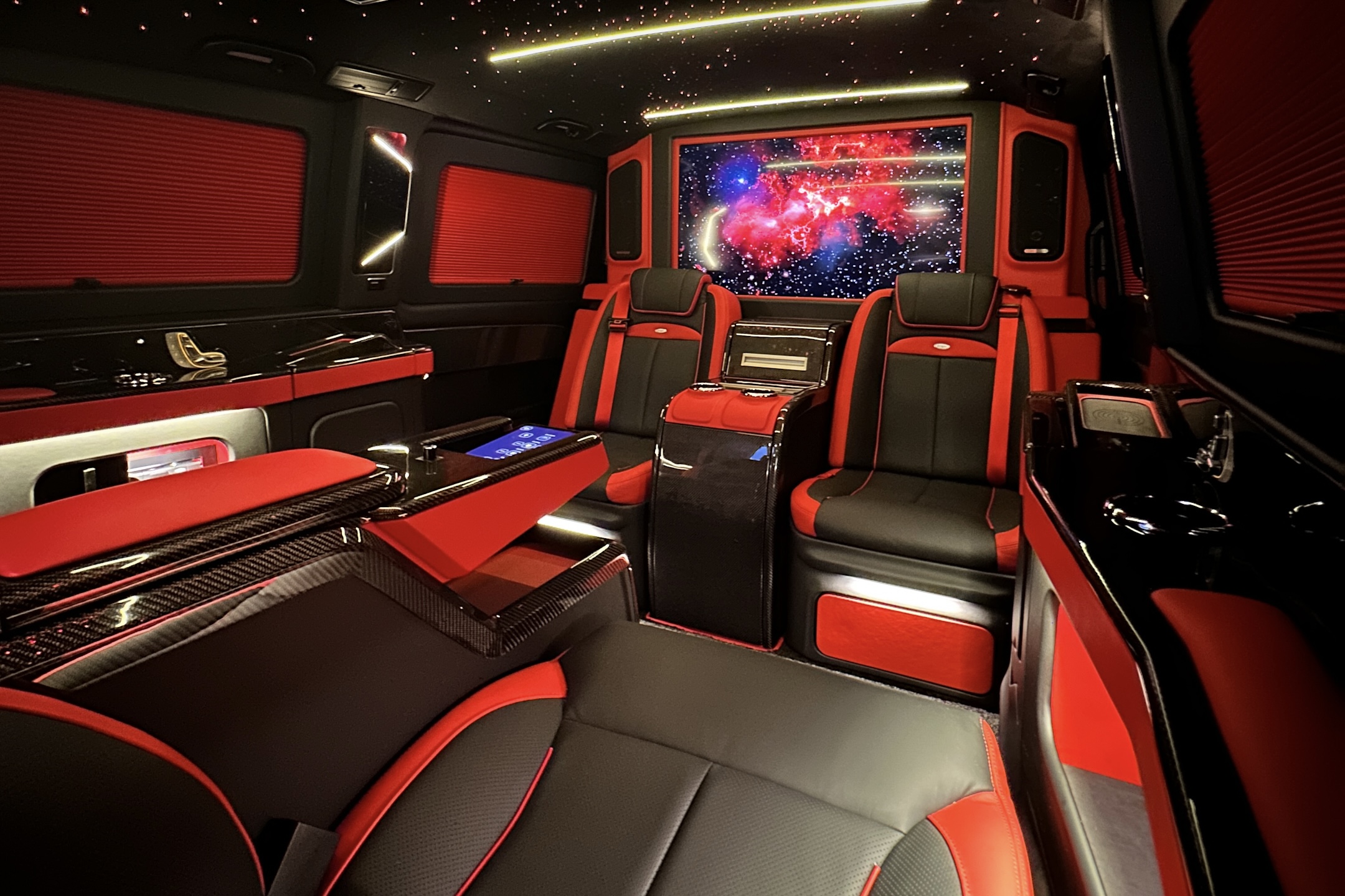 أربعة مقاعد فاخرة من جلد نابا، مزوّدة بالتدفئة وقابلة للاستلقاء الكامل لتمنح تجربة صالة راقية بكل معنى الكلمة. شاشة Smart TV بقياس 40 بوصة مع إمكانية الوصول إلى Apple TV وNetflix وDisney+ وAmazon Prime. سقف نجومي مميّز تعزّزه إضاءة محيطية ناعمة. Wi Fi عالي السرعة، وشحن لاسلكي أنيق، واتصال USB C، وتجربة راحة متكاملة بانسيابية تامة على متن المركبة.