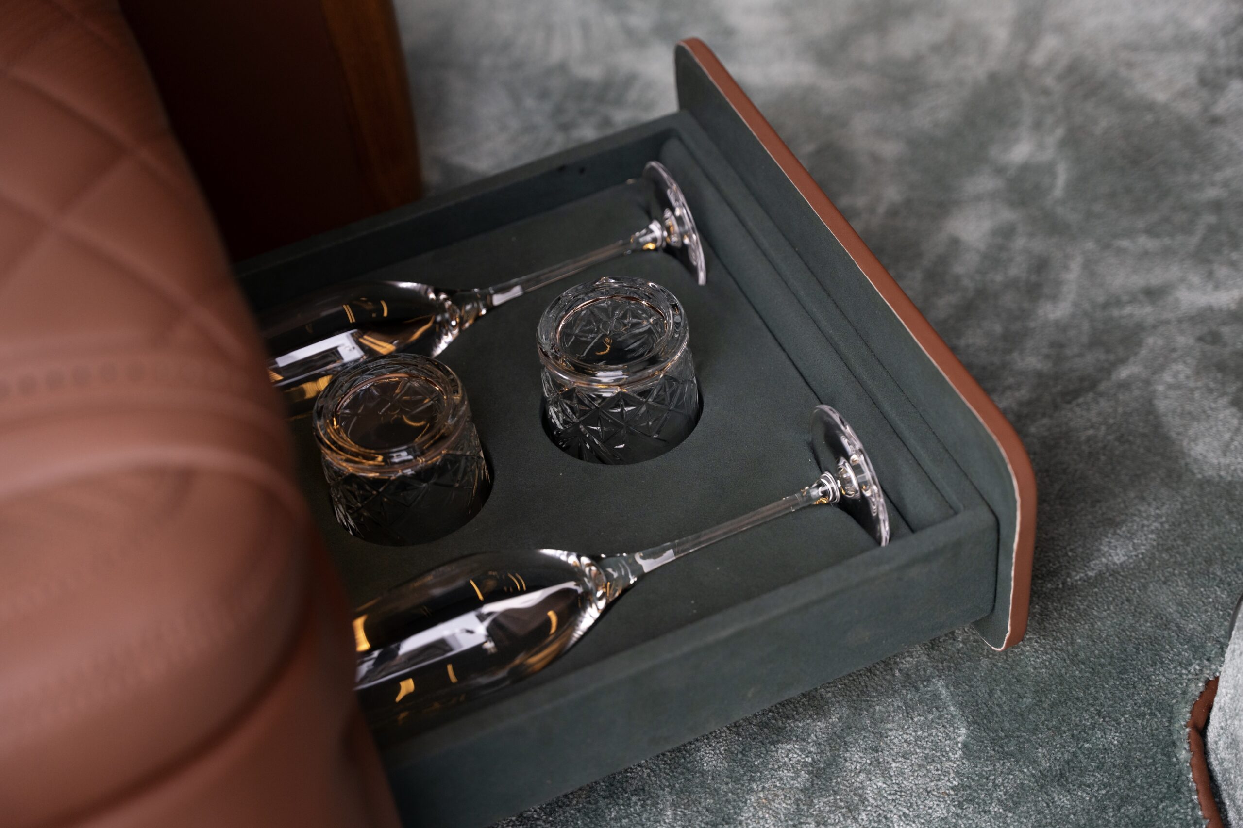 A refrigerated compartment, perfect for chilled beverages and champagne. Electric work tables, illuminated beauty mirrors, and intuitive control via a central touchscreen tablet. A refined champagne and cognac service, accompanied by delicate treats selected for your journey. A luxury umbrella, always available for your comfort.