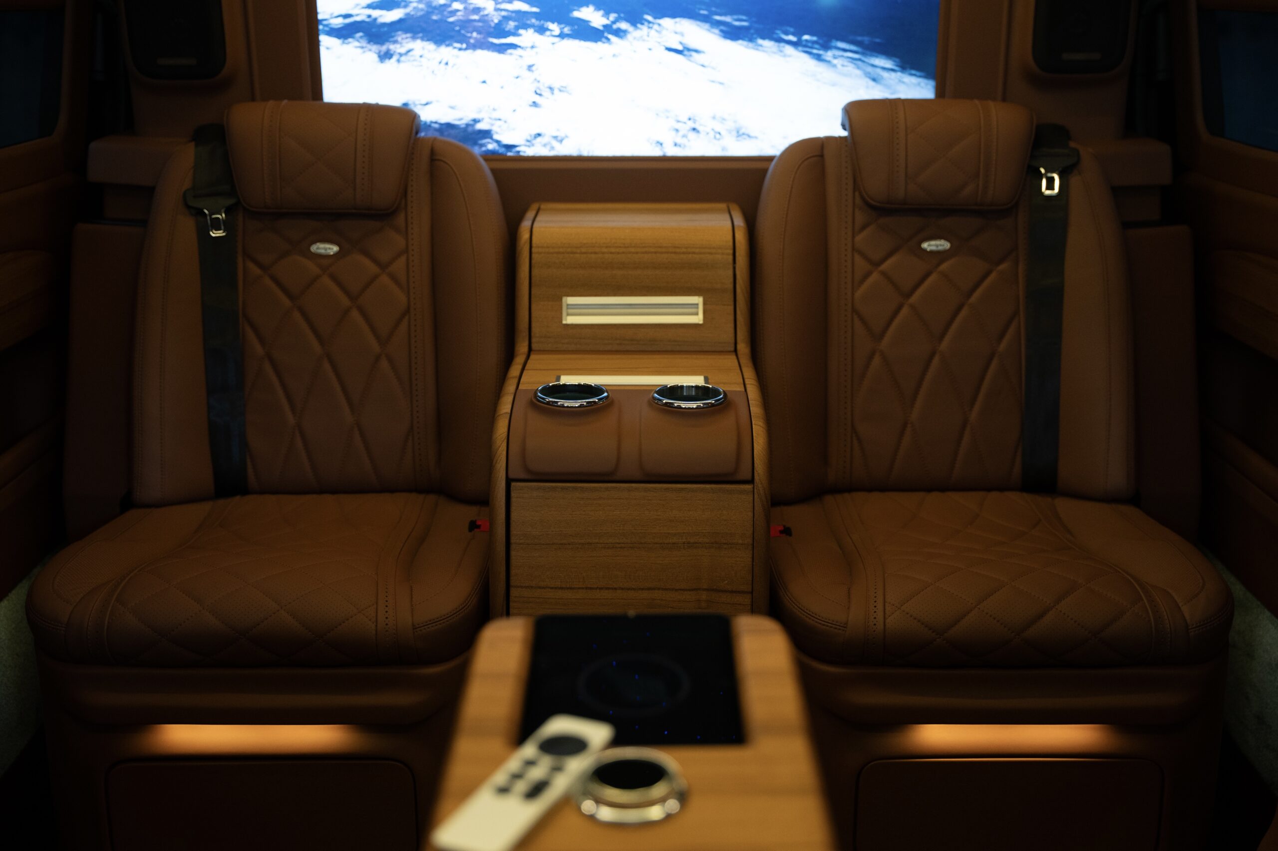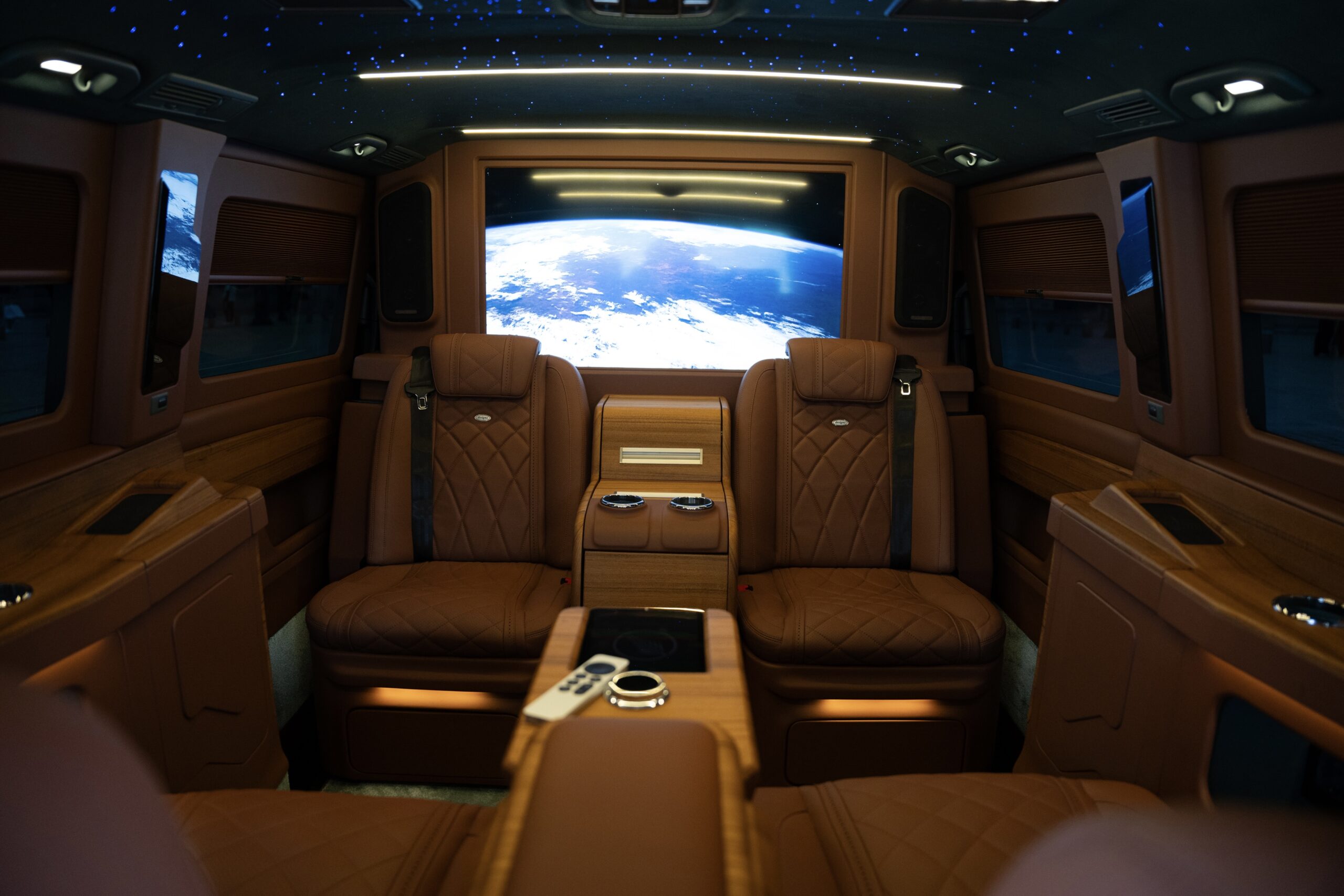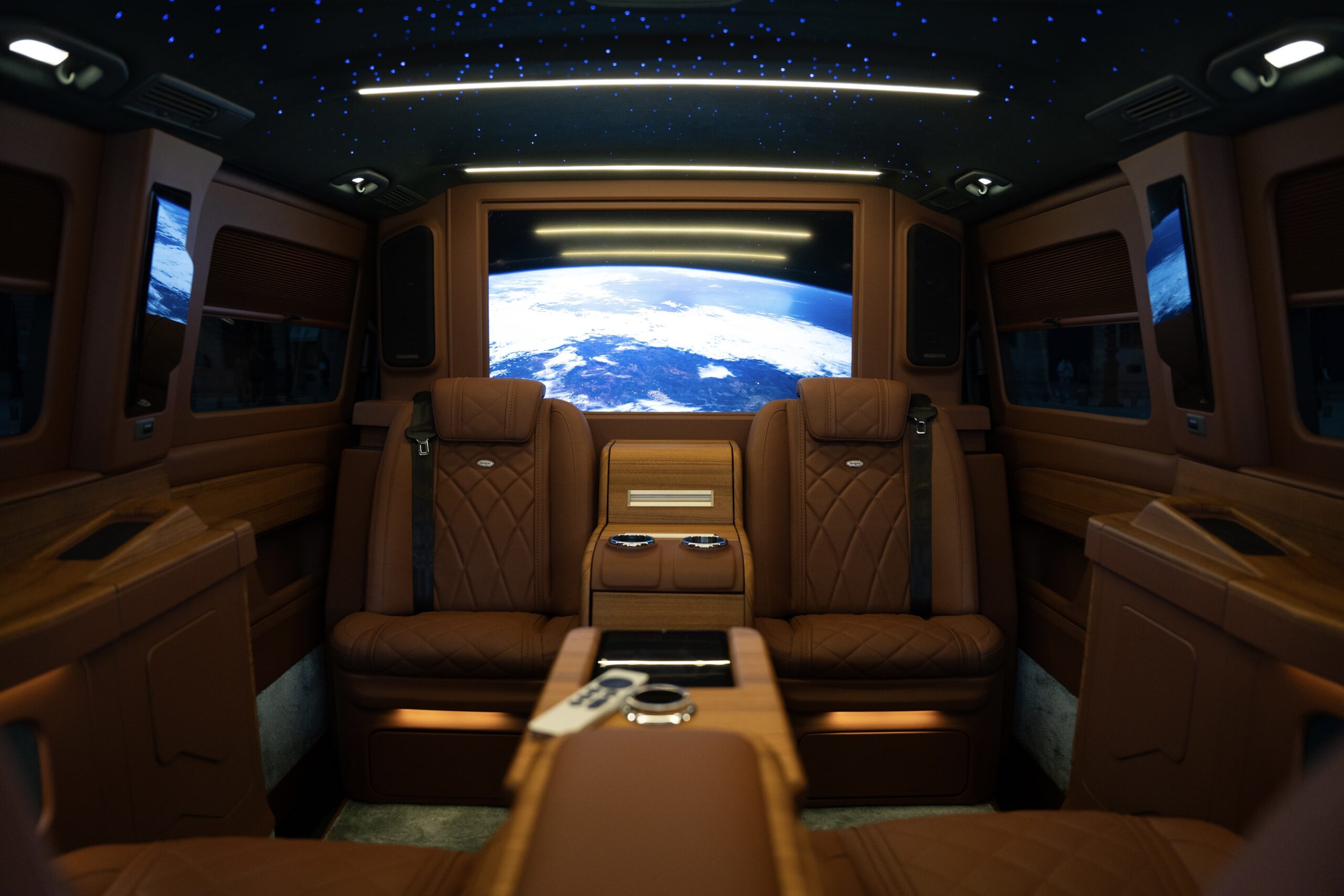 Four sumptuous Nappa leather seats, heated and fully reclining for a true lounge experience. A 40 inch Smart TV with access to Apple TV, Netflix, Disney+, and Amazon Prime. A signature starlight ceiling enhanced by soft ambient lighting. High speed Wi Fi, discreet wireless charging, USB C connectivity, and seamless onboard convenience.