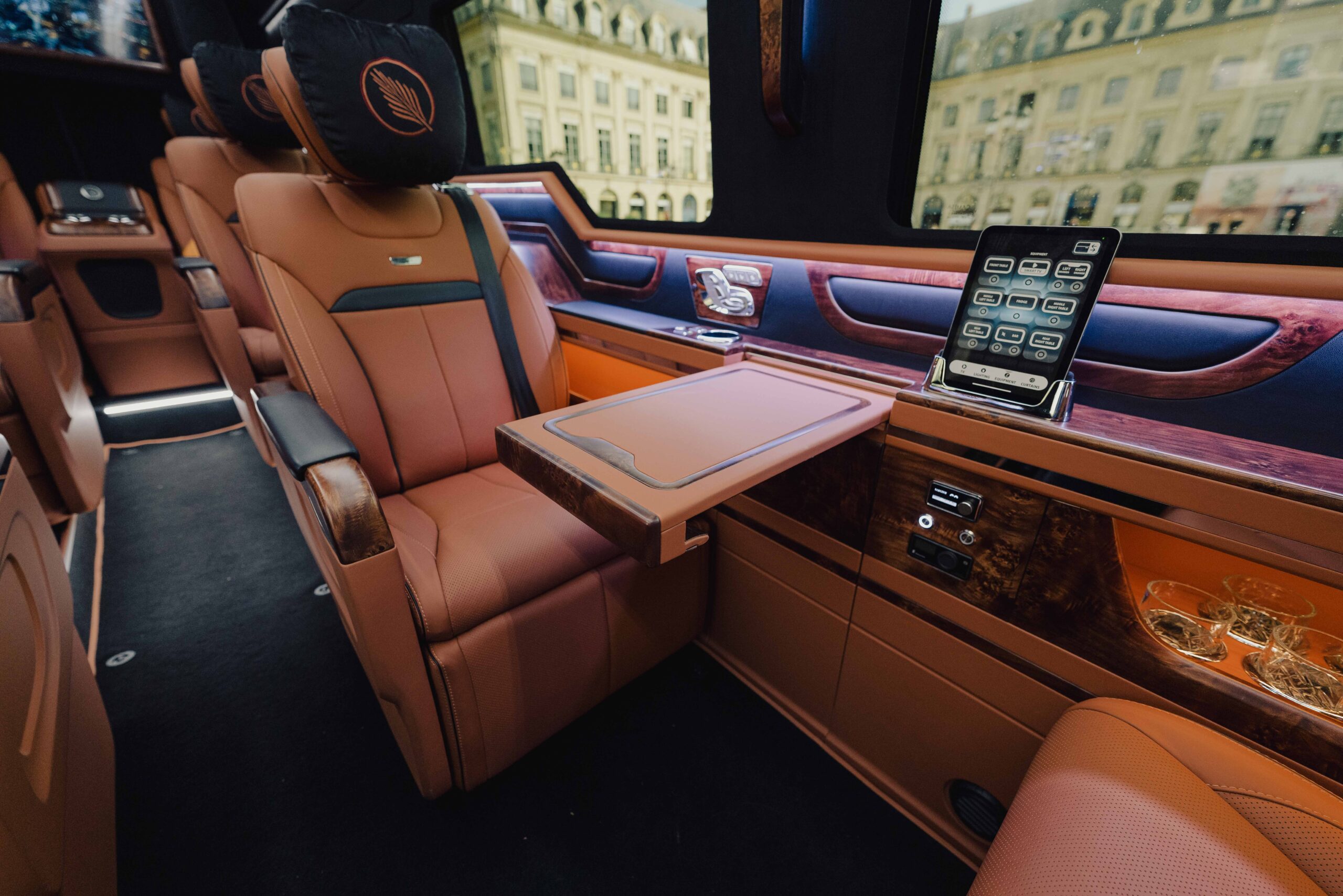 Generous luggage space, gourmet treats, and eight luxury umbrellas complete this exceptional setting. Perfect for long distance journeys, roadshows, and exclusive private evenings.